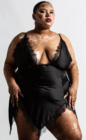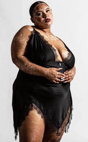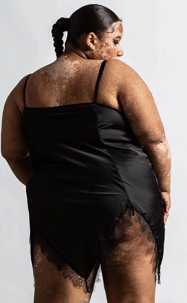 Say a Fatal Farewell with this gorgeous slumber number: made with a beautiful black satin, this nightdress features cami straps, a deep neckline and lacy trims. The skirt is cut into a hanky hem for extra dark deliciousness so you can lounge around in Morticia style and snooze like the dead.