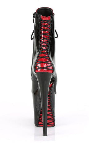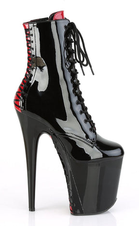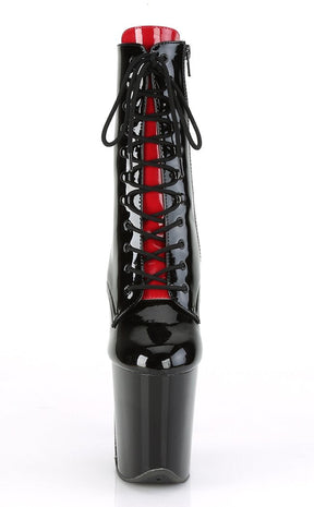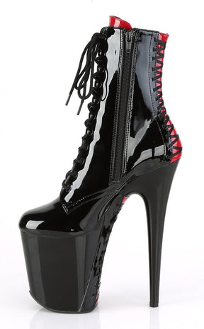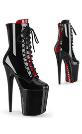 8"Heel, 4" PF Lace-Up Front Ankle Boot, with Interchangeable Color Tongues (Red & Black) and Corset Style Lacing on Platform Underside & at the Back, Inside Zip Closure