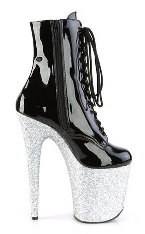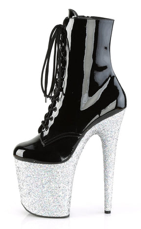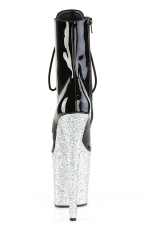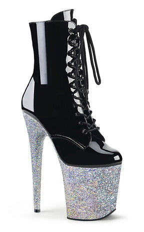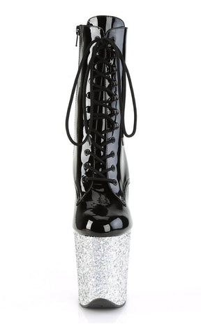 8" (200mm) Heel, 4" (100mm) Platform Lace-Up Front Ankle Boot Featuring Fully Wrapped Glitter Platform Bottom, Inside Zip Closure