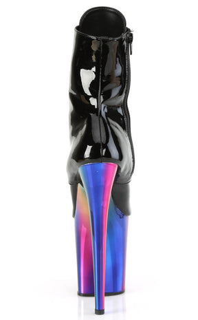 Fly over the cyber rainbow! The FLAMINGO-1020RC boots have a sleek, black patent upper while the heel and platform are wrapped in shining, rainbow chrome as a wicked contrast. The boots secure with a front lace-up and side zip.