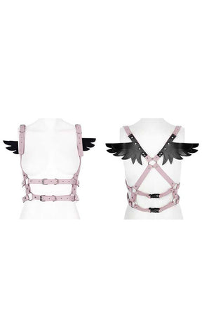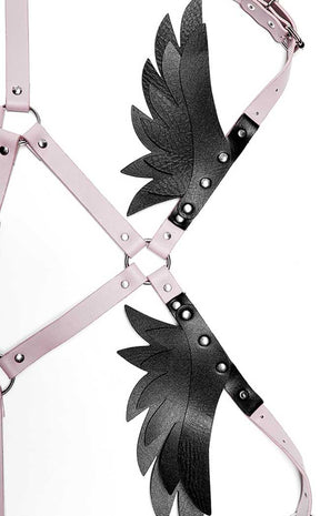The Fly By Night Harness will have ya feelin' the best combo of badass n' cute! Pastel pink faux leather straps form this cage-look underbust harness, featuring adjustable straps around the waist and shoulders. Two black wings sit on the back and will have ya ready to take flight.