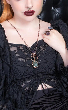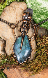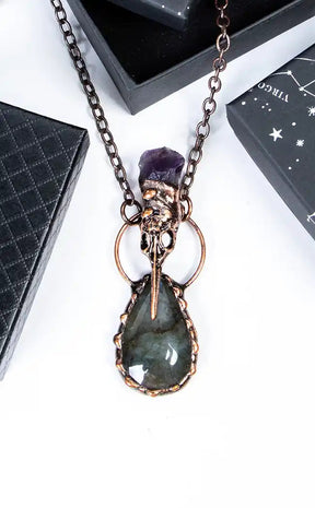 The Follow the Light Labradorite Necklace is made from a beautiful labradorite crystal that has been hand shaped into a teardrop shape and polished. Each pendant has been framed in bronze with a ravens skull charm and amethyst crown. The necklace secures with a large arch and includes a 70cm long antique bronze chain. These necklaces are hand made and each is beautifully unique.