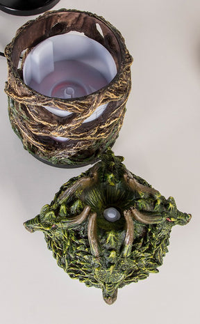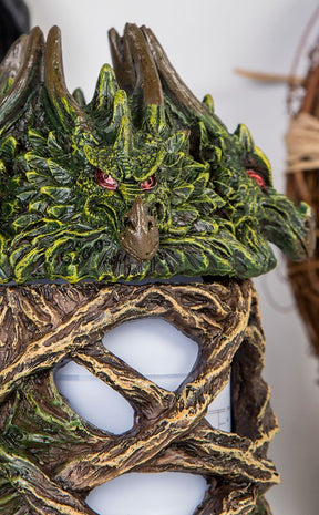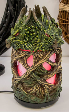 This humidifier lights up and changes colours, the warm light dancing between the branches that criss cross and grow around the lamp. The tops of the trees look like leaves from a distance, revealing 4 heads of a dragon when one chances a closer look.