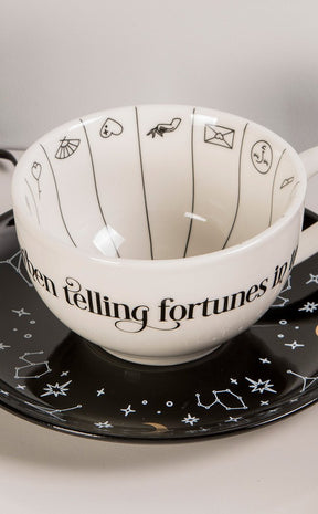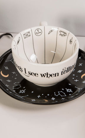 This unique teacup can both serve a generous brew and help you interpret the meaning of your tea leaves when you're finished! The inside is printed with symbols you may see in the leaves while the outside is printed with the phrase "Mysterious Things I See When Telling Fortunes In Tea". It comes with a contrasting black saucer printed with constellations and gold foil and an instructional leaflet on how to read tea leaves.