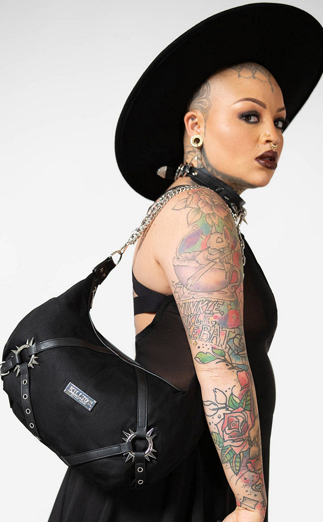 Show off yer wild side with the Furor Slouch Bag! Soft, faux suede fabric forms this roomy handbag, accented by faux leather harness details and two spiky metal charms. The bag comes with two detachable straps: one adjustable faux leather shoulder strap and a multi-layered chain strap so you can change up yer lewk in a snap.