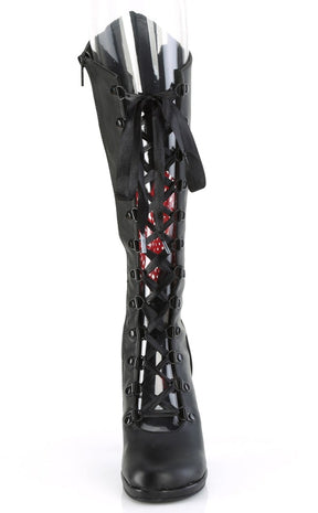 The GLAM-243 boots are real heartbreakers! The unique open lacing and pointed back make a bold statement along with the red lattice heart design on the rear.