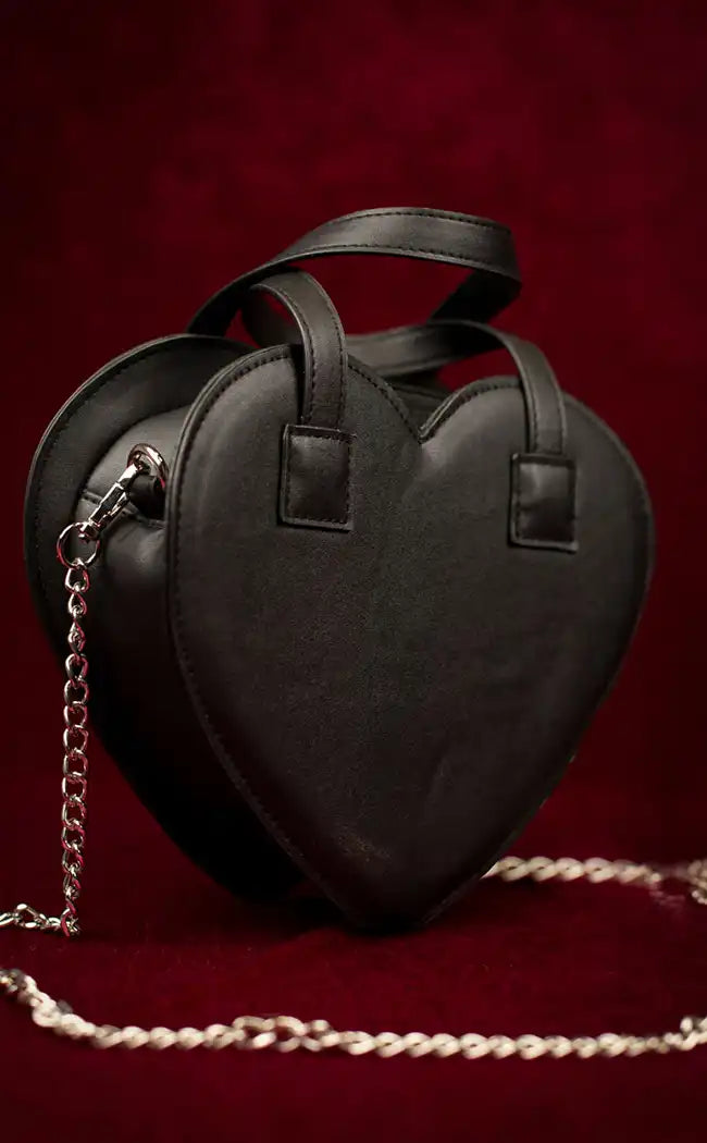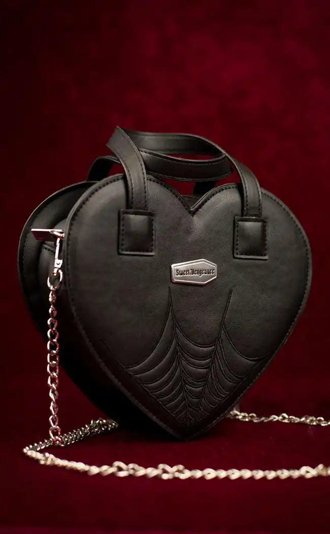 This heart shaped handbag channels indulgent gothic romance, featuring a stitched spider web design on the front, a detachable silver chain strap for your pleasure, and a delicious red interior. Zip this baby up to secure and use as your daily handbag, or pull it out for date night!