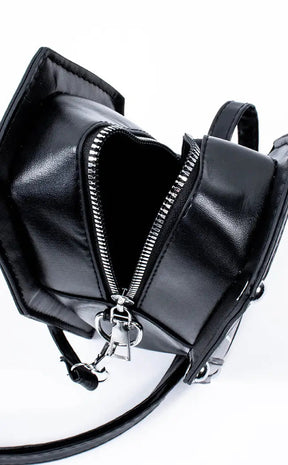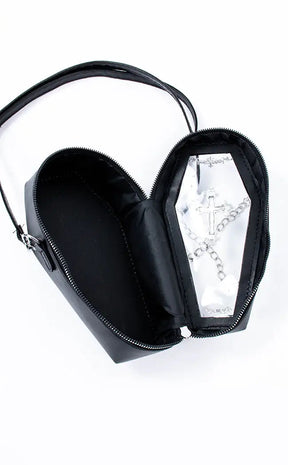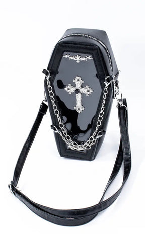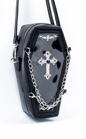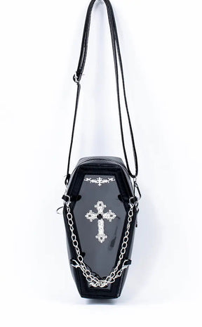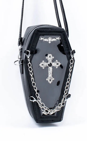 Black as night vegan leather, an intricate cross motif and two detachable chains going across the front come together in a coffin you'd be happy to be buried alive in. This coffin bag unzips almost all of the way around and features a transparent front, making it easy to grab your belongings without any hassle or struggle.