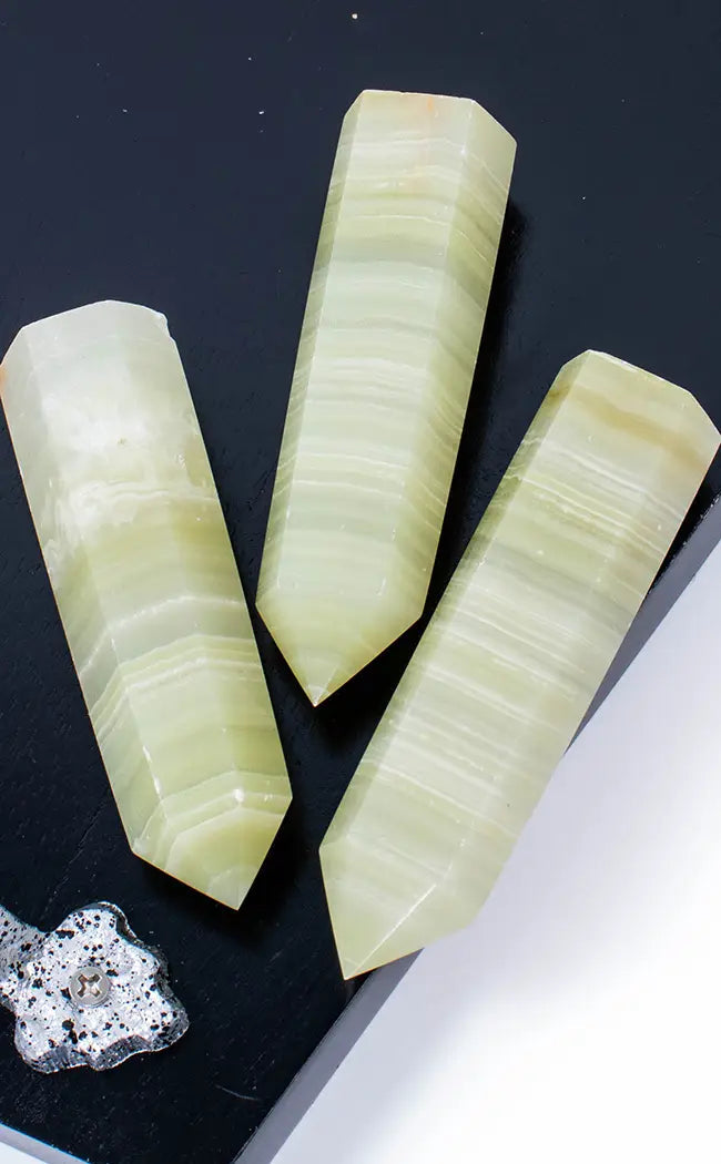 Green Onyx is often mistaken for Emerald and Jade but differs in formation and structure. It is formed through the layering of Chalcedony and Quartz in a cryptocrystalline formation, whereas Emerald, for example, is a Beryl formation. The color of Green Onyx is a rich, deep green and it is primarily found in Brazil, India, Madagascar, Mexico, Peru, and the USA.