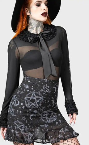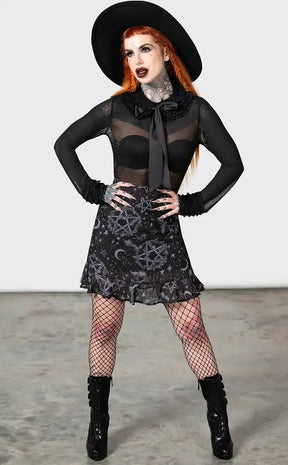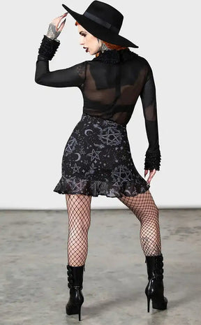 This mini skirt brings dark witchy vibes, but is cool and flowy enough for a summergoth look! The flattering high waistband secures with a hidden side zipper. chiffon style mesh flares to a ruffle hem.
