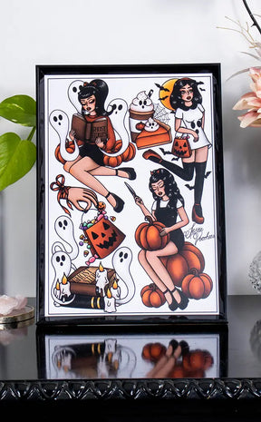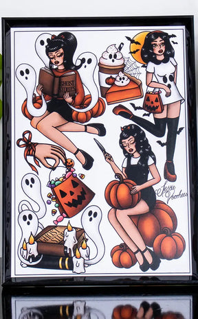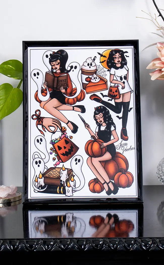 This beautiful artwork was done by Jessie Voorhees in her distinctive style. This print features tattoo flash designs of ghosts, pumpkins, and plenty of Halloween vibes.