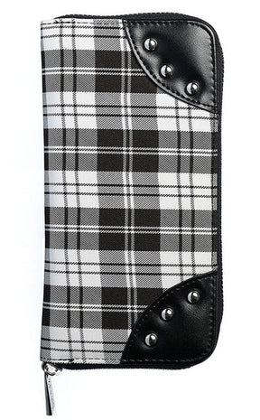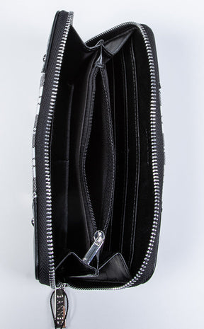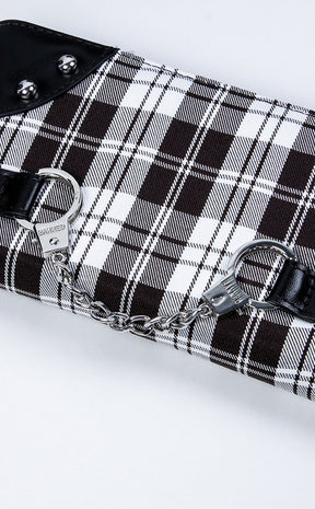 The Handcuffs Wallet features a punk AF tartan design with handcuff chain and vegan leather with studs. Internally it has a full paper money slot, zipped section for coins, and 12 card slots. Decked out in eye catching black & white tartan it has a wrap-around zip closure.