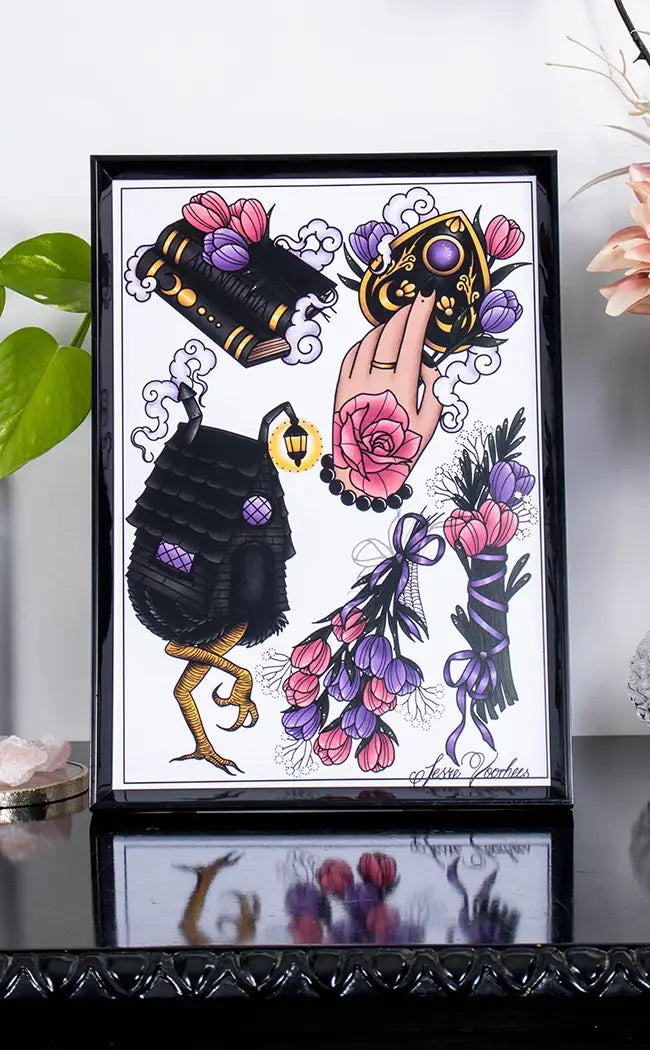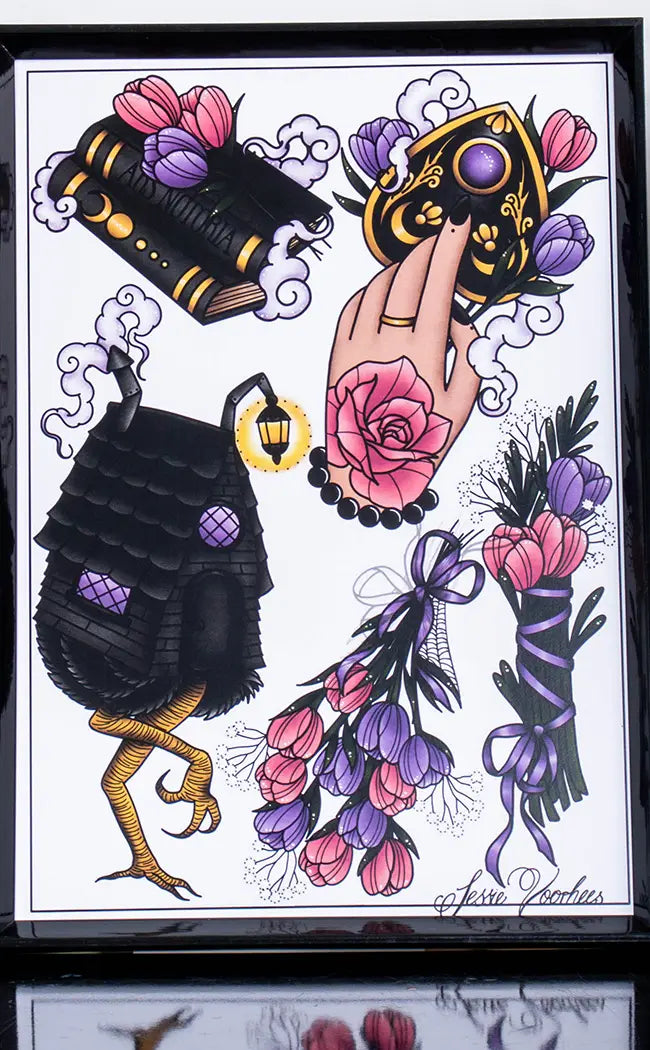 This beautiful artwork was done by Jessie Voorhees in her distinctive style. This print features tattoo flash designs of a harvest of delicate flowers in an array of shades of pink and purple.