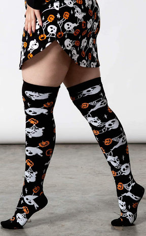 Get yer legs nice n cosy with ghosts and pumpkins, the only friends you'll ever need! Made with a soft acrylic blend, these socks are super stretchy and go all the way over the knees.