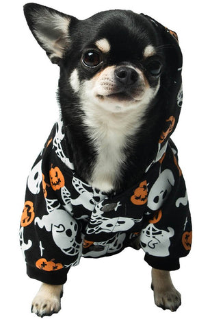 Keep your furbaby warm and Halloween ready with the Haunted Pumpkin Pet Hoodie. Made of super-soft jersey, this little outfit features a large hood, a vibrant spooky print and sleeves for the front legs. The hoodie secures with press studs for no stress on/off.