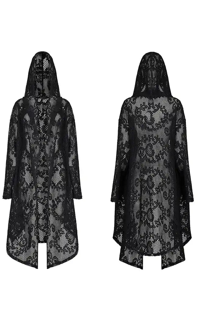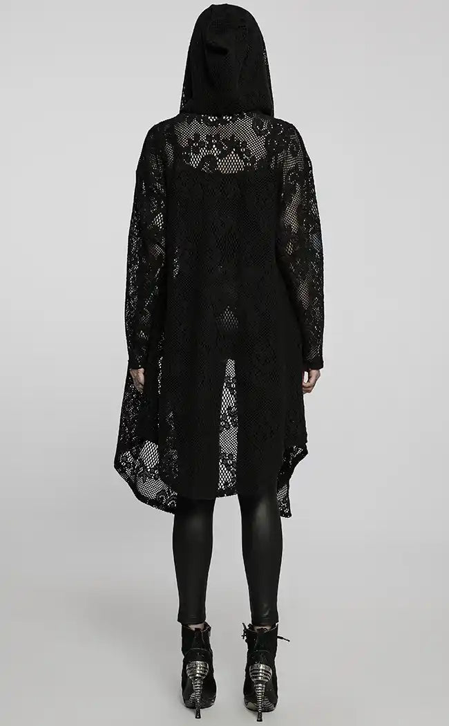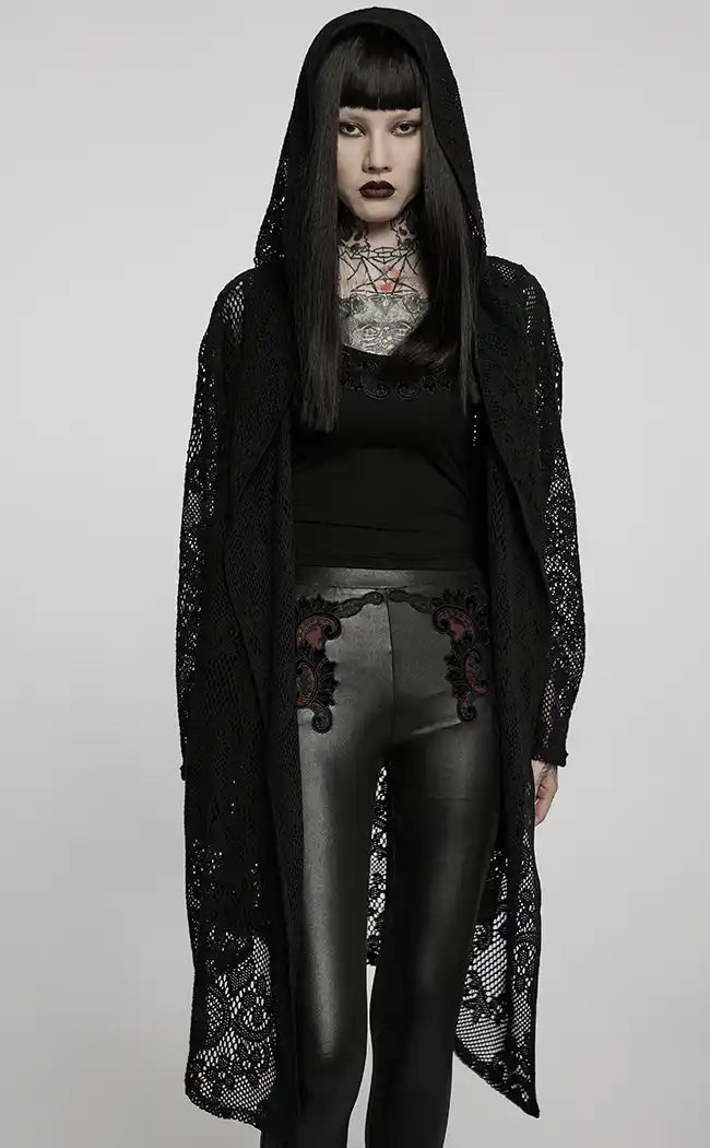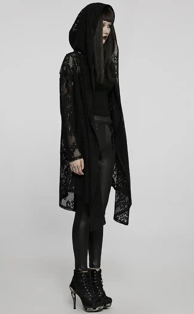 Bring out your inner forest witch with the Hecate Lace Cardigan! Made from stretchy comfortable lace with a dark floral pattern. A dramatic hood adds a touch of mystery and the hem reaches about mid thigh.