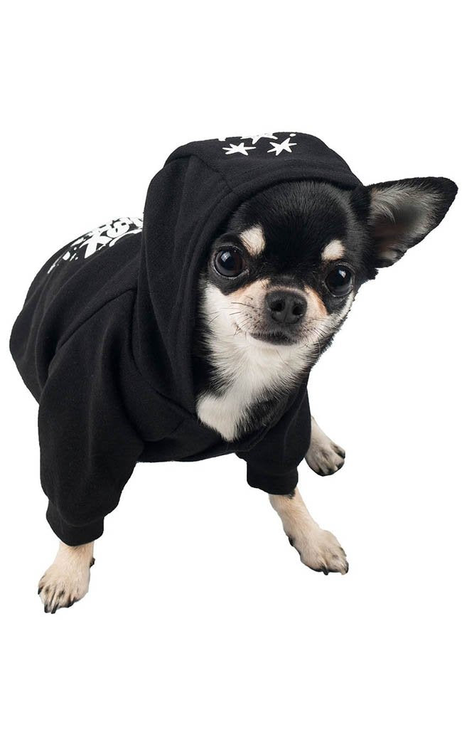 If your familiar is more of a guard animal, give people a warning with his hoodie! Made of super-soft jersey, this little outfit features a large hood, a bold, white print and sleeves for the front legs. The hoodie secures with press studs for no stress on/off.