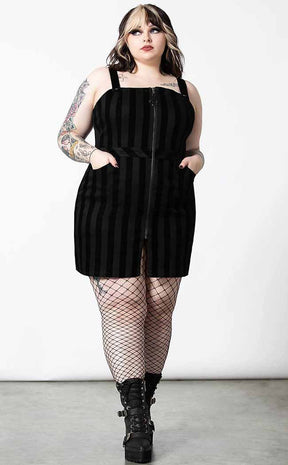 Show off yer curves in the Holystone Zip Dress! This wicked minidress is made with statement denim with flocked stripes and minimal stretch for a structured look. Extra deets include metal rivets, pockets and a full-length zip topped with an inverted cross pull.
