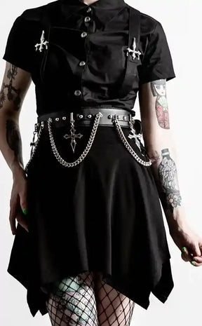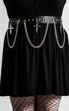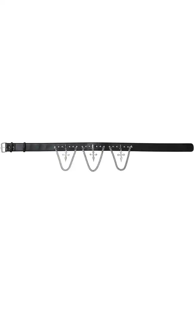 Add some drama to yer bag o' tricks! Exaggerated cross decals and draping chains hang from this studded belt, securing with an adjustable belt buckle.