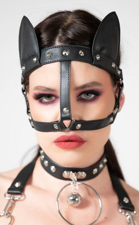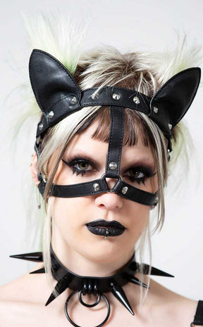 The Hungry 4 You Headpiece is for powerful kitties who know their worth. Soft, faux leather forms statement kitty ears on this headpiece; statement studded straps snake their way over the eyes and face, adjusting with comfortable elastic at the back.
