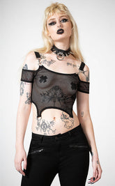Add a punk edge to yer wardrobe with the Hurricane Fishnet Crop Top! Soft, stretch fishnet forms this bardot style crop, featuring statement buckled straps and D rings.