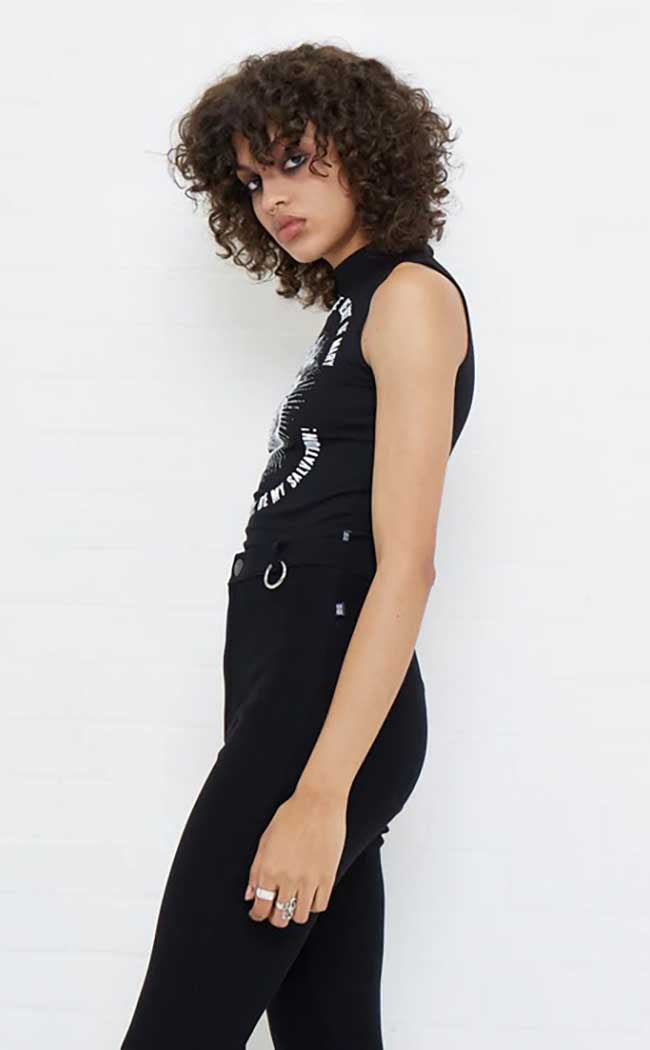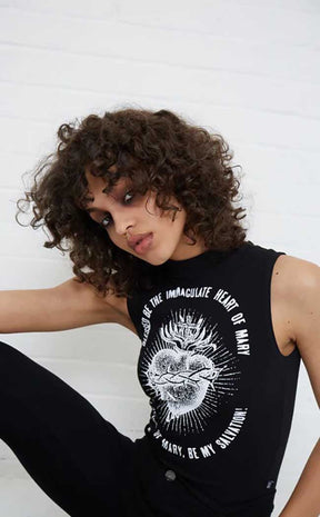 Bless your wardrobe with the Immaculate High Neck Top! Soft cotton jersey clings to yer bod in a slim fit, forming a high neckline and a waistline that sits at the natural waist. The print creates a stunning statement, with a contrasting white heart print and text that reads "Blessed be the immaculate heart of Mary, sweet heart of Mary, be my salvation!".