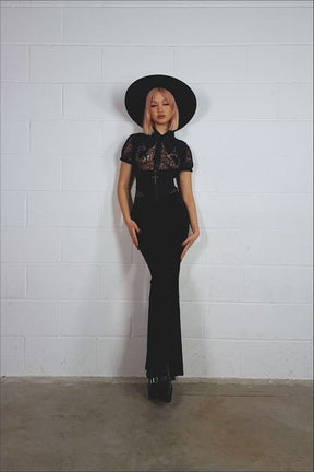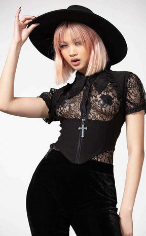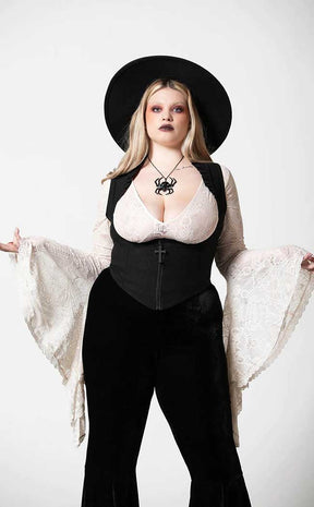 Unlock a new dimension of styling with the Isobella Corset Top! The soft, stretch fabric fits snug to your body in an underbust cut, featuring a zip front topped with a cross charm. The sleeves are trimmed with ruffles to have you feeling fancy and in charge, the perfect companion to blouses, dresses n tops.
