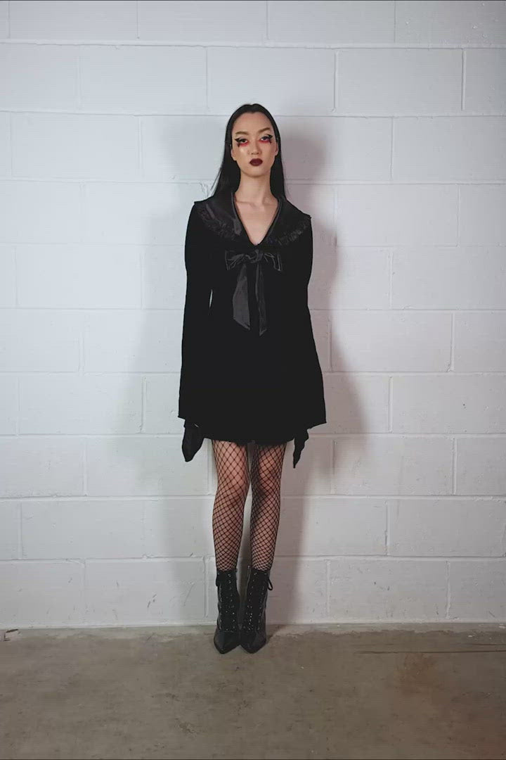 Get yer spooky sailor on in the Itsura Dress! This super cute minidress is made with soft touch velvet that forms statement puffy bell sleeves and a fitted waist. An oversized, frilly collar made of sateen fabric draws the eye, tied off with a cute ribbon.