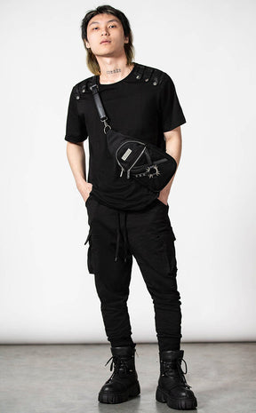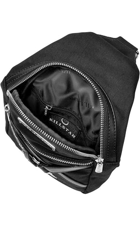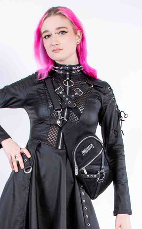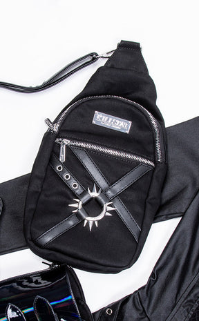 The Jackal Crossbody Bag will have you howling for more! This versatile bag comes with a detachable, adjustable chain to wear across yer body as a backpack or on your chest, perfect for keeping yer sh*t safe at festivals. The front zip pocket features a faux leather harness detail with a spiked charm, while the main compartment features an inner zip pocket for extra storage.