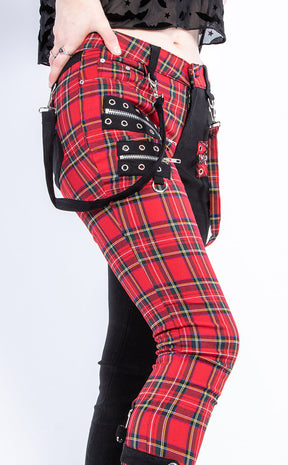 The Jetsetter Trousers are a badass way to show all yer sides to the world: these skinny fit pants feature a split design of red tartan and black, decked out with wicked punk deets like detachable bondage straps, chunky zip decals, D rings and pockets.