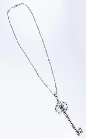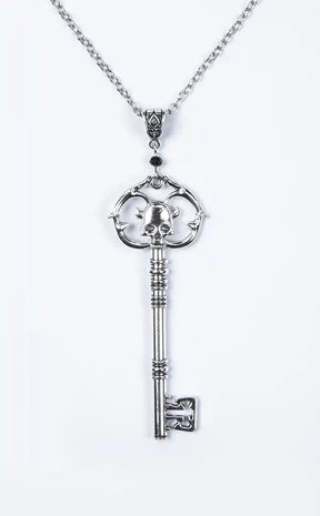 This necklace features a detailed skeleton key with skull detail on a 50cm long silver look chain. It is made from light alloy metal and is perfect to goth up any outfit.
