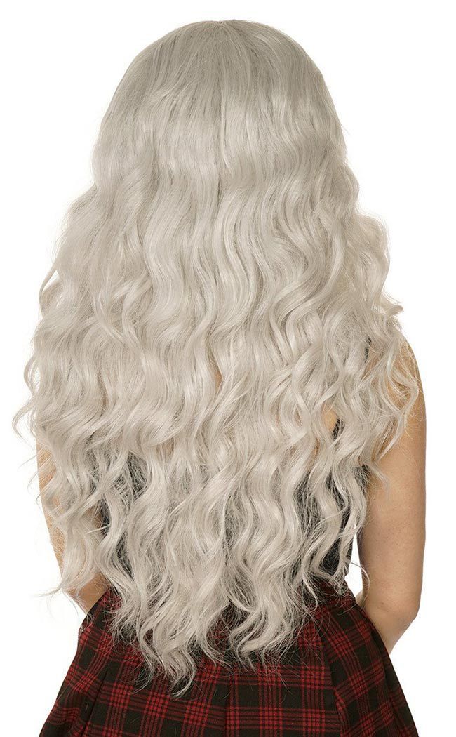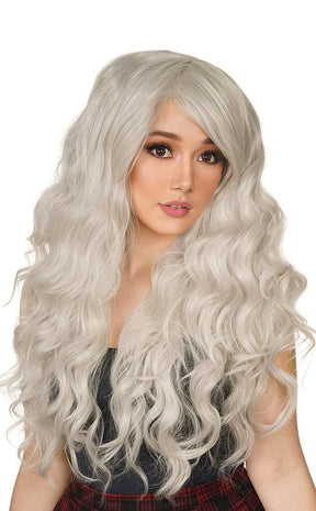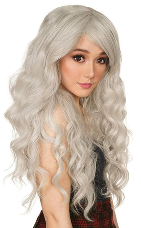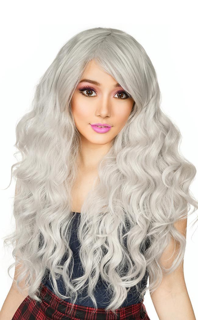The most purrfect gothic lolita wig in dreamy silver. Style has loose cascading curls and long, side-swept bangs which can be trimmed or styled to suit your face.