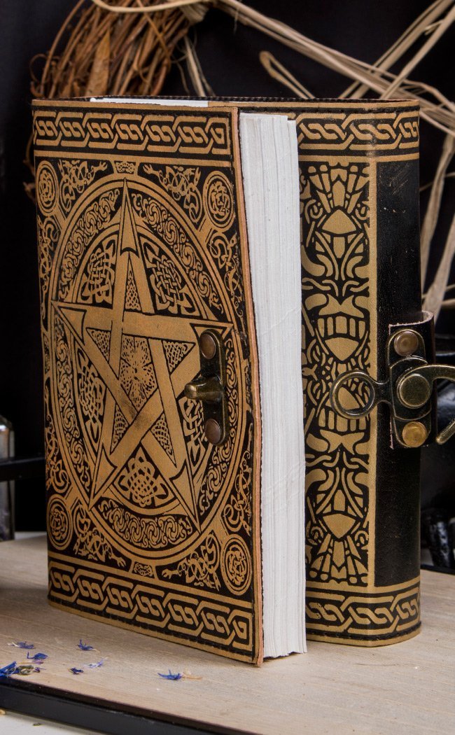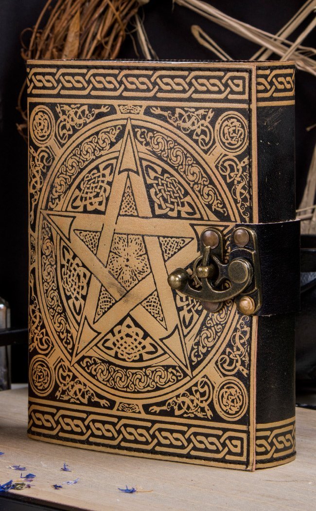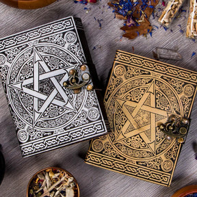 The cover is decorated with intricate patterns in gold print. Celtic filigree surrounding a pentagram in a circle - a pentacle. Design wraps around the journal on both sides and the spine. It has a sturdy brass coloured metal lock.