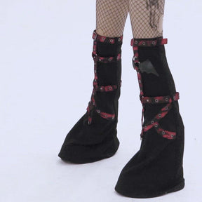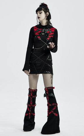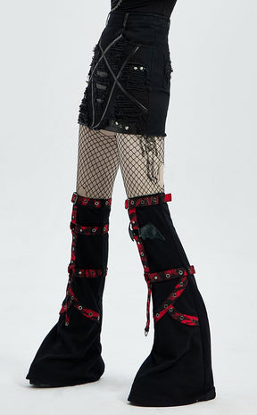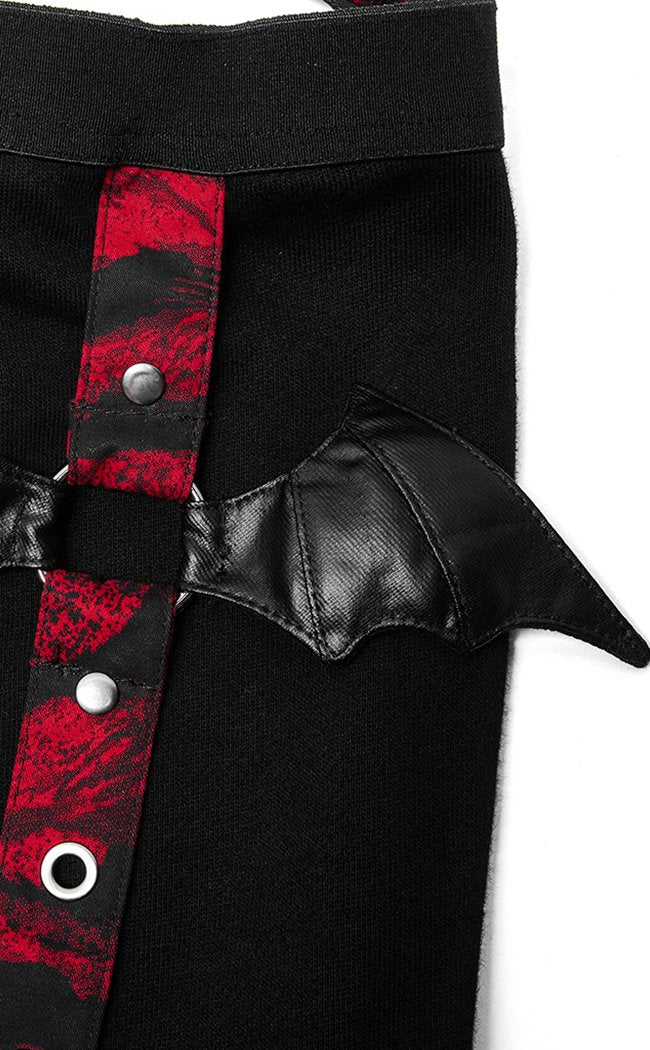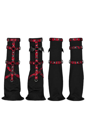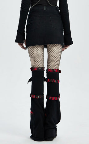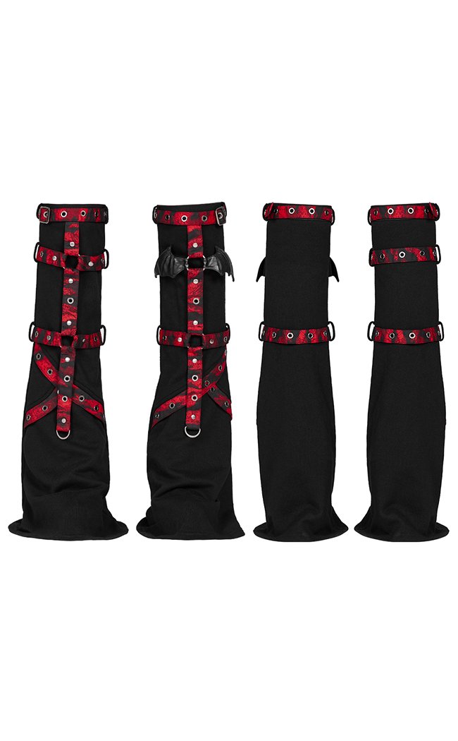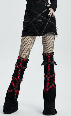 Add a little wild style to yer wardrobe with these wicked legwarmers. Made with a black stretch material that drapes beautifully, these babies are topped off with a wicked harness that features O rings and a set of bat wings.