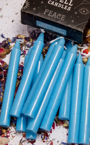 Boxed pack of 12 light blue spell candles for use with rituals to attract peace. Candle magic is one of the simplest forms of spell casting in which the caster decides on a goal, visualizes the end result and focuses intent or will to manifest that result.