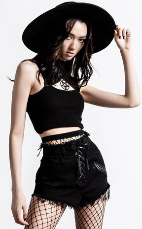 Take on the leagues of hell in killer denim! It's a one woman showstopper of frayed hems, 5 pockets and a seductive lace up front. The high waist is fitted so you can match up yer fave crops and flatter yet amazing bod. The rear pocket is complete with pentagram embroidery, in case you need to summon a can of whoopass.