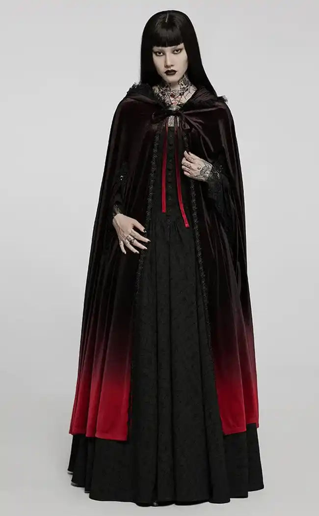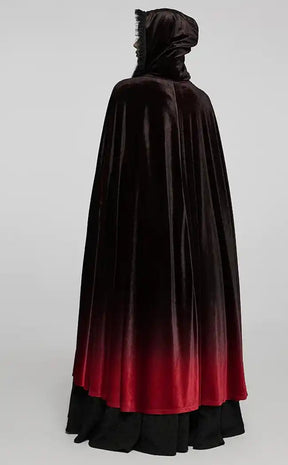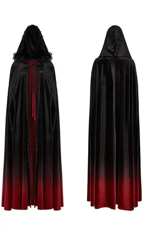 Walk with an air of mystery in the Lilith Cloak! This stunning piece is made from dense velvet fabric and trimmed with black lace. The design features a rich sumptuous gradient of black and red colour which creates shimmering patterns as you walk.