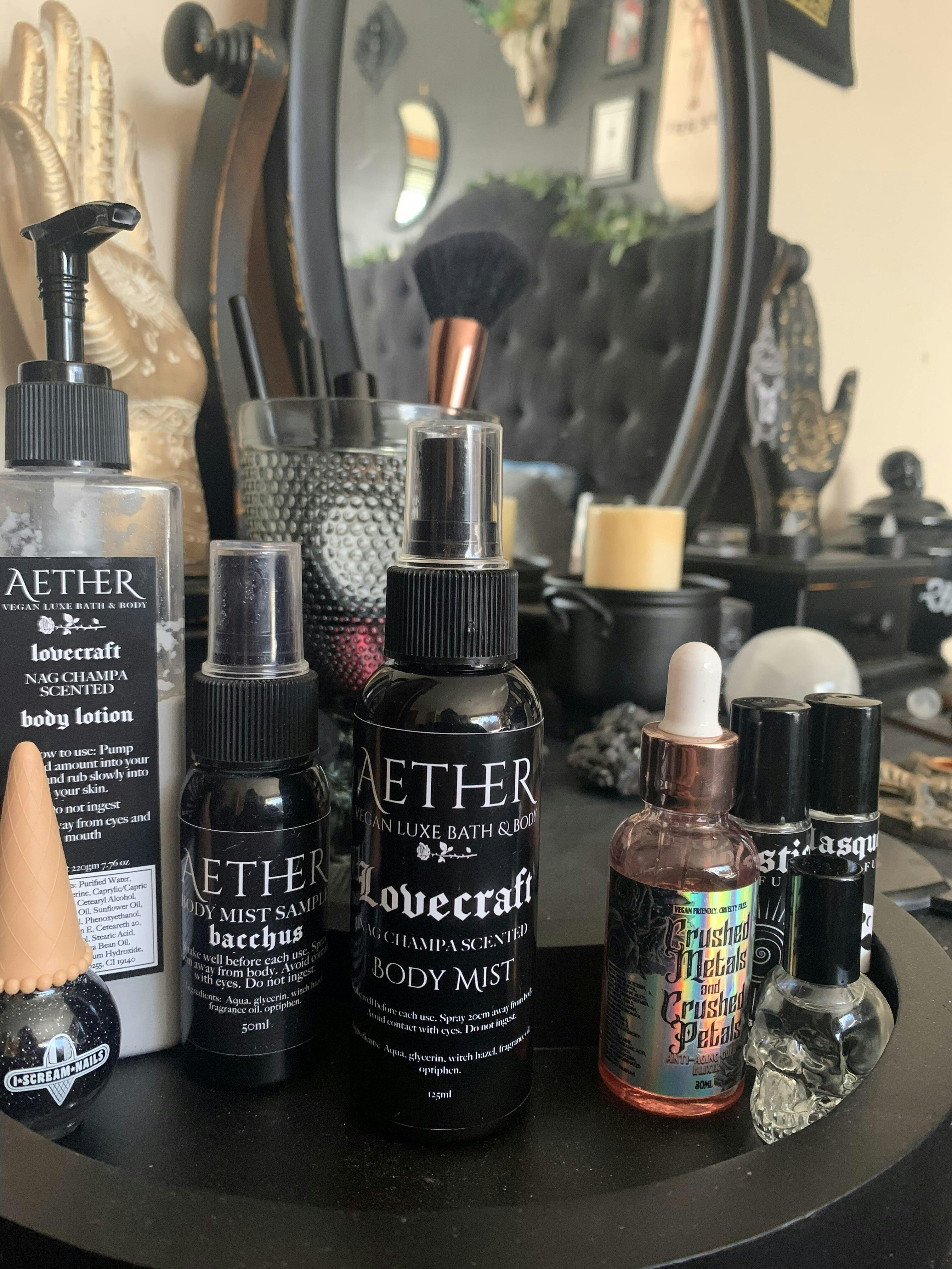 Black as your soul but scented like nirvana. This body mist turns the finishing touches of your beauty routine into a ritual fit to please the Old Ones! Aether products are locally made from the best ethically sourced ingredients and the Nag Champa scent is dialled up to max volume.