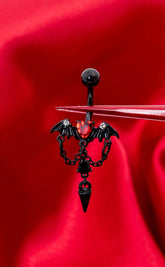 Exquisitely forged from surgical steel, this fallen angel belly ring features a sparkling red zircon heart encased by gem studded black bat wings. Below the heart hangs two black chains with a black zircon teardrop and a spike at the end.