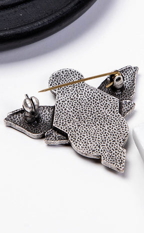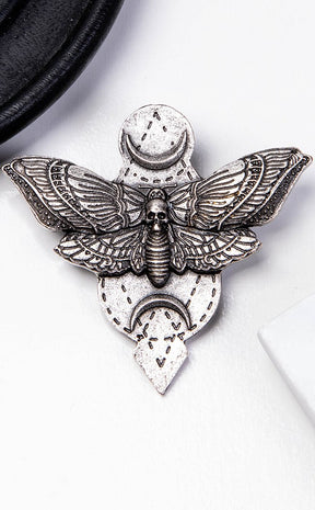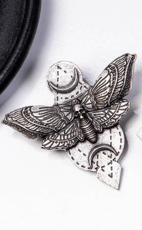 This beautiful brooch features a deathly moth perched on a background of geometric lines, crowned by crescent moons.