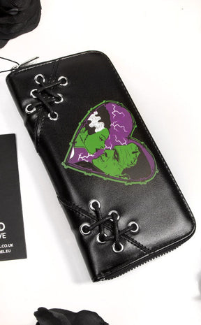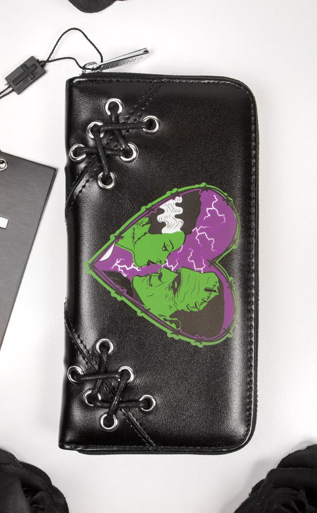 Bring a little horror-romance to yer pocket change! Banned's classic wallet design gets a horror update with artwork of Frankenstein's monster and his bride, sitting in a heart with lace up decals in the corners. The wallet secures with a zip and contains plenty of card slots and a change pocket.