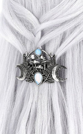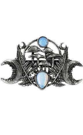 The barette depicts a grove of magic mushrooms, flanked by fern leaves, crescent moons and opal gems.