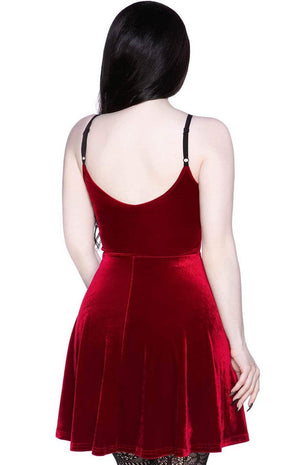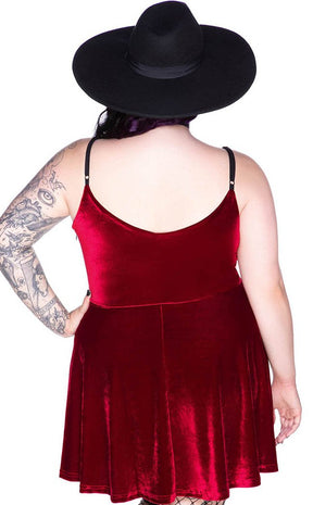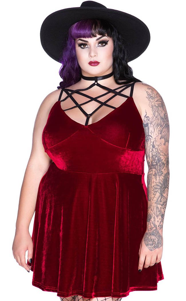 Perfect for casting spells of enchantment. This soft slinky and flowy dress is made from the softest stretch velvet. It gives you the perfect flattering shape with tapered waist and flowing skirt. Hexagram strappy neckline feature gives it that extra dash of magic. Wear at midnight.