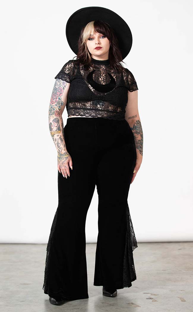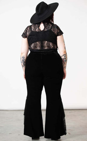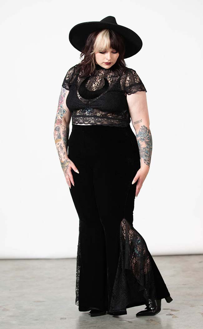 Step out with an air of mystery in the Mahina Velvet Bell Bottoms. Soft, stretch velvet forms these fitted flares, featuring a high, wide waistband for a comfort fit and lace inserts that flow like liquid shadow with every step.