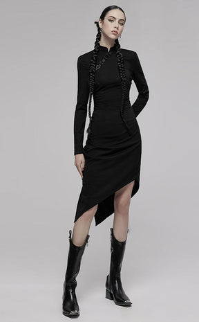 Show some fine lines and scandalous leg action in the Maxine Asymmetrical Dress. This warm midi dress is perfect for crisp winter outfits, featuring long sleeves, a Cheonsam style collar and slant buckle decal across the chest. The asymmetrical skirt gathers at the side to flatter the waist and create a flattering silhouette.