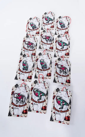 12 enamel pins on 12 gift tags with 12 packaging ropes.