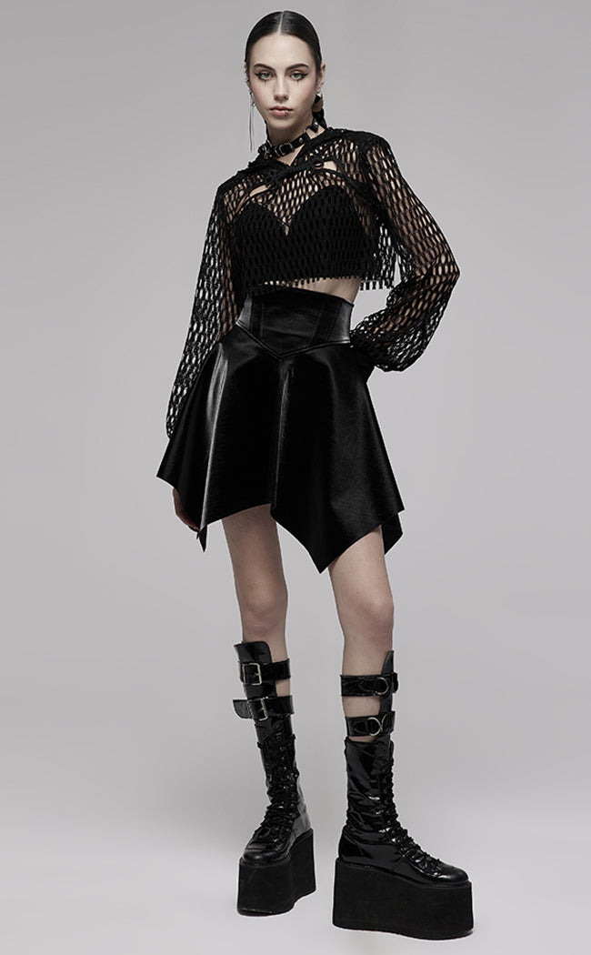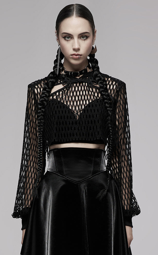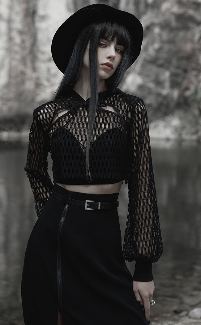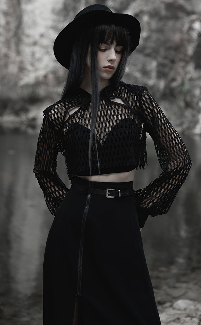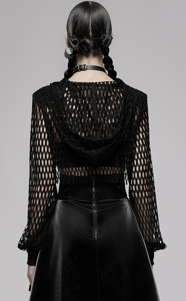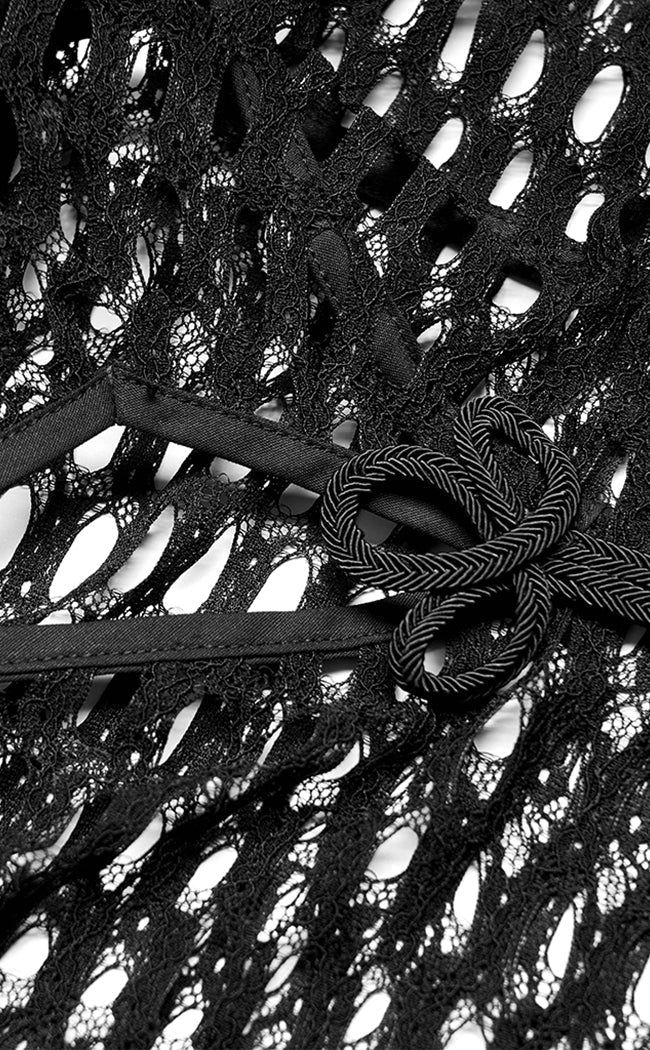 Catch 'em n yer web with the Rapture Pullover! Wide mesh forms puffy sleeves with close-fitting cuffs, a large hood and cutouts on the yoke secured with a twisted tie at the throat.