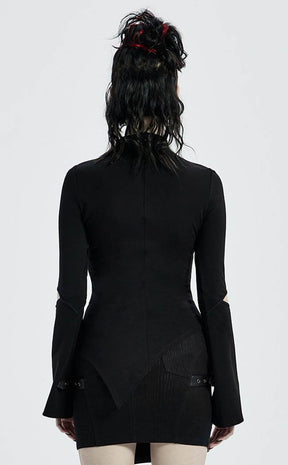 This sleek showstopper features a mesh yoke with a pentagram strap feature, sitting beneath the studded high neck collar. The sleeves flare slightly and have edgy cutouts at the elbows. The asymmetrical hemline takes this baby further into the dystopian future, perfect for wearing over jeans or inside flowing skirts.