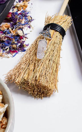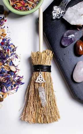 This mini besom is small enough to be placed on an altar or carried while travelling. It has a cute Celtic knot and crystal charm attached. To maximize the effectiveness of your besom, it is recommended that you bless and anoint it. You can use one of our spell oils such as protection or luck.