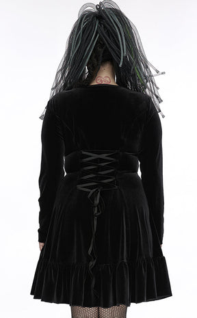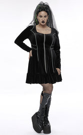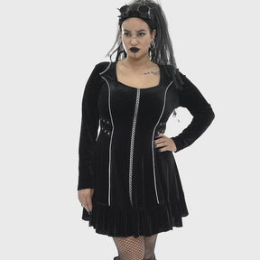Kit up in the futuristic glam of the Mircea Velvet Dress! Soft stretch velvet forms this long sleeve dress, featuring a wide neckline, a skater skirt, and a fitted waist decked out with eyelets and lacing at the back. Fluorescent trims create a "jacket" look and chain embroidery runs down the front in an eyecatching detail to make you stand out from the boring masses.